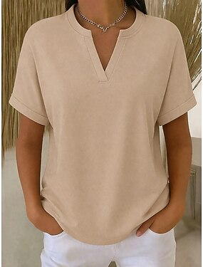Mulheres Camiseta T-shirt Tecido Moda à moda Clássico Manga Curta Decote V Tops regulares Diário Para Noite Final de semana Branco Rosa Cáqui Cinzento Verão Primavera