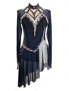 Vestidos para Patinação Artística Mulheres Patinação no Gelo Vestidos Azul Marinho Patchwork Thumbhole Com Stretch Treino Competição Roupa para Patinação Clássico Cristal / Strass Manga Longa