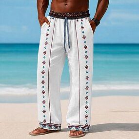 Homens Calças de linho Calças Calça verão Calças largas Calças de praia Cintura elástica tecido Perna reta Geométrica Conforto Respirável Comprimento total Diário Ao ar livre Praia Férias Boêmio