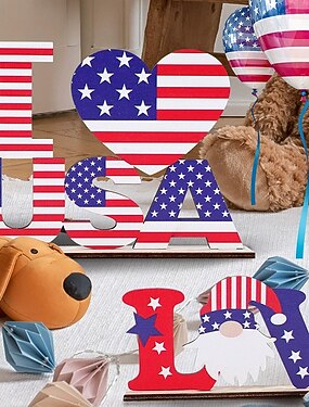 Conjunto de 5 enfeites de mesa de madeira com letras para o Dia da Independência, Dia Nacional dos Estados Unidos, importante feriado para a libertação americana.