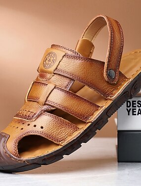 Sandálias masculinas de couro sintético bege com tira ajustável, ideais para atividades ao ar livre, férias de verão e momentos de lazer.