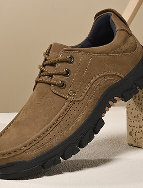 Tênis masculino cáqui de camurça sintética com cadarço, resistente e antiderrapante, ideal para caminhadas e atividades ao ar livre.