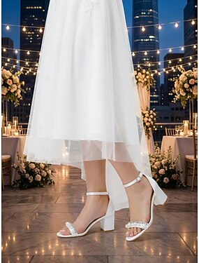 Sandálias femininas de salto bloco com cristais na cor marfim, elegantes sapatos de noiva com tira no tornozelo para casamentos modernos na cidade.