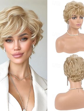 Perucas loiras estilo pixie para mulheres - corte de cabelo curto e natural em camadas, peruca sintética resistente ao calor para uso diário, loira clara.