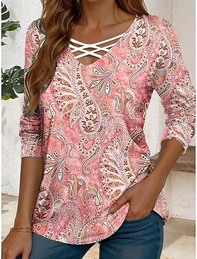 Mulheres Camiseta Com Corte Imprimir Gráfico Estampado Cashemere Vintage à moda Clássico Manga Longa Decote V Tops longos Diário Azul Amarelo Rosa Verde Verão Primavera