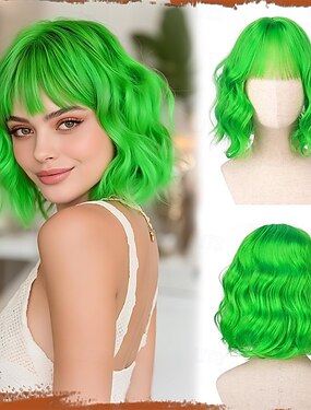 Perucas Verdes Peruca Sintética Cacheada Bob Com Franja Curta Cabelo Sintético Verde Mulheres Moda Suave