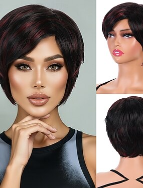 Perucas sintéticas Reta natural Bob curto Parte lateral Peruca 8 polegadas Preto / Vermelho Cabelo Sintético Feminino Côr Misturada