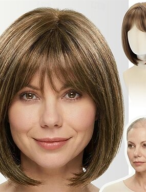 Peruca curta estilo bob castanho mel com franja para mulheres brancas, 30 cm, lisa, fibra sintética resistente ao calor, fibra proteica, realista, leve, para uso diário ou festas.