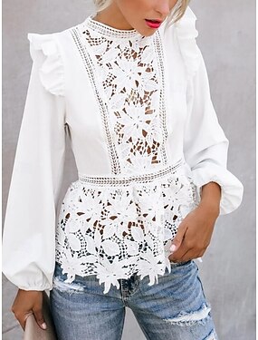 Mulheres Camisa Social Blusa Tops de renda Blusas de manga comprida Renda Tecido à moda Básico Clássico Manga Longa Pescoço Tops regulares Diário Feriado Para Noite Branco Verão Primavera