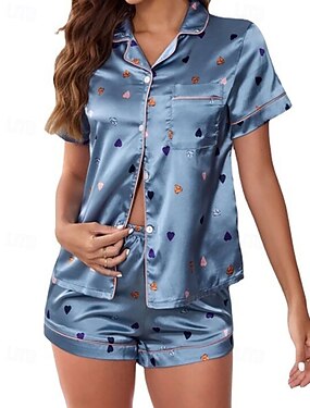 Mulheres Loungewear Conjunto de Pijama Moda Casual Macia Coração Patchwork Botões Calção Casa Férias Manga Curta Lapela Azul Branco Rosa Cinzento Verão Primavera Outono Normal