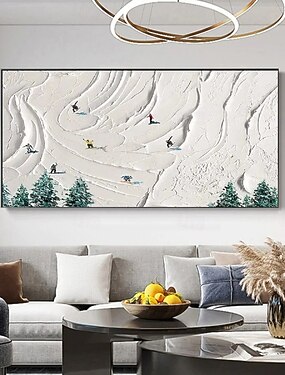 Pintura a óleo 3D feita à mão, cena de esqui com montanhas cobertas de neve, pinheiros, cores vibrantes, texturas ricas, pinceladas detalhadas, sombreamento realista para decoração de casa