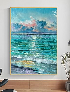 Pintura a óleo feita à mão sobre tela, arte de parede, abstrata, desenhada com espátula, estrela, mar, pequeno barco, paisagem, decoração para sala de estar, hall de entrada, decoração para casa,