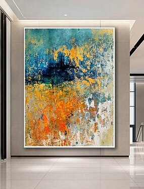 Pintura a óleo feita à mão em branco, laranja e azul, pintura abstrata com pinceladas à mão, obra de arte moderna, extra grande e vibrante, decoração de parede personalizada para casa.