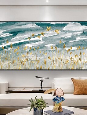 Pintura a óleo artesanal de luxo com detalhes em folha de ouro, abstrata, em tela, estilo nórdico moderno, mural decorativo para parede de casa ou hotel.