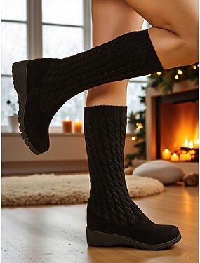 Botas de inverno femininas de malha preta até a panturrilha – botas de cunha quentes e confortáveis para clima frio e roupas casuais
