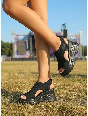 Sandálias esportivas femininas pretas da moda com plataforma - sapatos de plataforma respiráveis em Flyknit com sola robusta, ideais para festivais de música e shows ao ar livre. &Moda urbana ousada