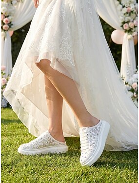 Tênis slip-on feminino branco de renda para noiva - calçado confortável com detalhes em strass para casamento no jardim.