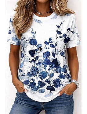 Mulheres Camiseta Imprimir Floral Gráfico Plantas à moda Clássico Casual Manga Curta Gola Redonda Decote Redondo Tops regulares Casual Diário Branco / azul Rosa Verde Verão Primavera Outono