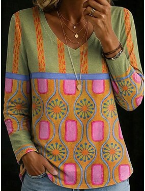 Camiseta Feminina Manga Longa Gráfica Geométrica Plantas Básica Manga Longa Gola Pile V Neck Tops Regulares Diários Esportes Fim de Semana Botões Estampa Verde Cinza Primavera Outono Inverno