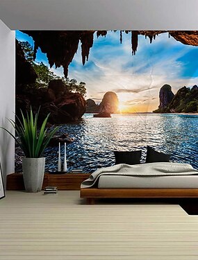 tapeçaria com paisagem de plantas da floresta, cachoeiras e lago, cenário moderno, quarto bonito, sala de estar, dormitório universitário, fundo para fotos, decoração para casa.