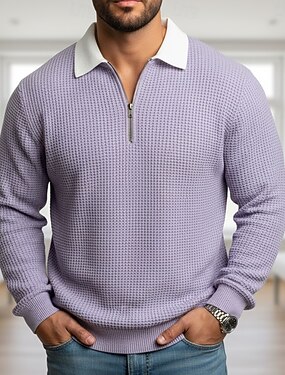 Homens Camisas Polo Waffle Textura Casual Rua Manga Longa Moda Lazer Bloco de cor Textura Zip Up Outono Primavera & Outono Outono & inverno Normal Roxo Verde Cinzento Azul Claro Camisas Polo Waffle