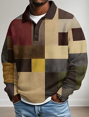Homens Geométrica Bloco de cor Camisas Polo Waffle Textura Manga Longa Camisas polo Lapela Roupa de Esporte Casual Escola Roupa Esportiva Roupa Diária Impressão 3D Outono & inverno Azul Marron Verde