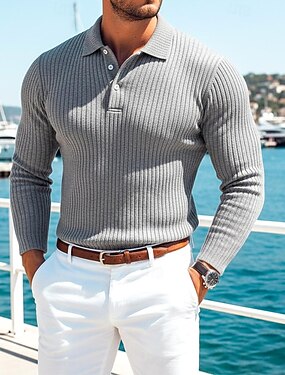 Homens Top de malha canelada Textura Casual Rua Lapela Manga Longa Básico Moderno Tecido Botões Primavera Outono Todas as Estações Normal Branco Azul Marinha Cinzento Azul Claro Top de malha canelada