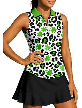 São Patrício Mulheres Leopardo Clover Camisa Esportiva Camisa polo de caminhada Regata Camisa de tênis Sem Manga Zíper Floral UPF50+ Resistente a UV Elasticidade Alta Pavio Humido Respirável Voleibal