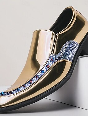 Sapatos masculinos de verniz dourado, modelo slip-on, com detalhes em cristal - calçado de luxo para festas e eventos de gala.
