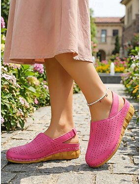 Tamancos femininos rosa-claro perfurados com tira no calcanhar – calçados leves, respiráveis e confortáveis para uso casual, caminhadas, viagens, jardinagem e dia a dia.