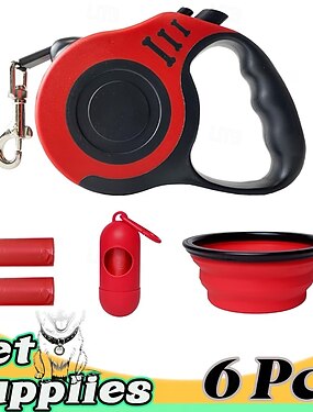 Conjunto de 6 peças para viagem com animais de estimação, incluindo coleira retrátil automática, guia tratora, prática e com alça antiderrapante, adequada para cães de pequeno e médio porte.