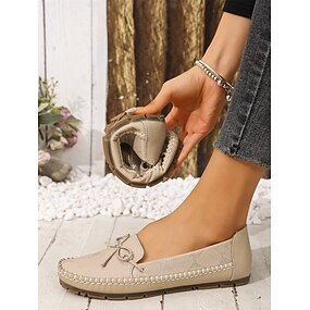 Mocassins Femininos em Camurça Amêndoa com Laço e Design Texturizado - Mocassins Confortáveis Slip-On para Uso Casual e Diário