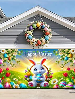 Faixa de Páscoa para porta de garagem com coelho e ovos coloridos, decoração religiosa de Páscoa para porta de garagem, enfeite sazonal externo para a celebração da Páscoa em família.