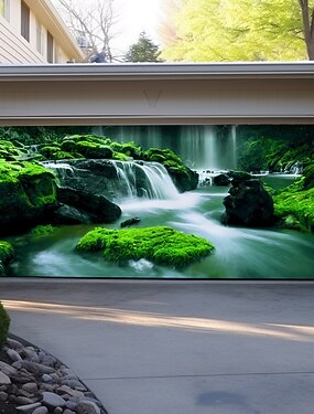 Banner de porta de garagem com cachoeira em floresta de musgo verde exuberante, outdoor 3D com paisagem natural, mural externo para cobertura de casa, resistente às intempéries, decoração externa em