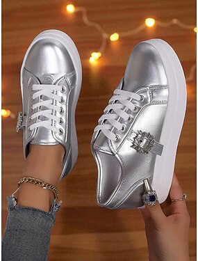 Tênis de noiva feminino prateado com cadarço e strass, sapatos de casamento brilhantes e confortáveis para noivas em casamentos ao ar livre no jardim.