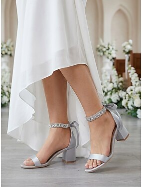 Sandálias femininas prateadas com salto bloco, sapatos de noiva de bico aberto com tira no tornozelo e cristais para casamentos na igreja.