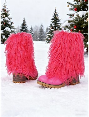 Botas femininas rosa-claro de cano médio com salto alto e forro de pele sintética - botas modernas de salto grosso para o inverno, eventos de fim de ano e festas de Natal.