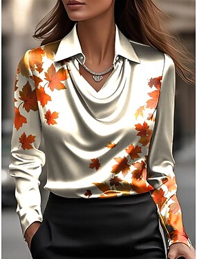 Mulheres Camisa Social Imprimir Com Pregas Folha Elegante à moda Casual Manga Longa Gola Boba Tops regulares Diário Trabalho Feriado Laranja Primavera Outono