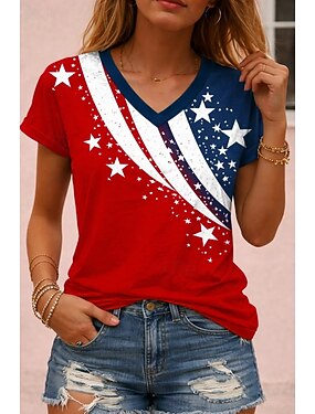 Dia da Independência Americana Mulheres Camiseta Imprimir Gráfico Bandeira Vintage à moda Clássico Manga Curta Decote V Tops regulares Diário Vermelho Ferrugem Preto Branco Vermelho Verão Primavera