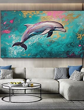 Pintura abstrata de golfinho pintada à mão em tela de grandes dimensões, pôster de arte de parede com tema animal, decoração de interiores, ideia de presente para golfinho
