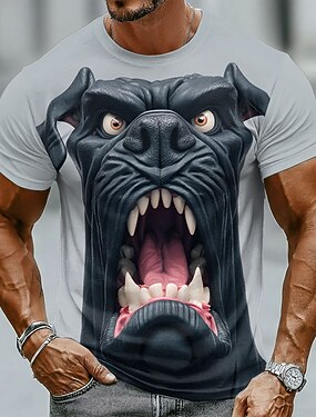 Camiseta masculina streetwear com estampa realista de cabeça de bulldog preto rugindo e dentes afiados, gola redonda, manga curta, cinza, ideal para academia, treino e uso casual. Presente perfeito