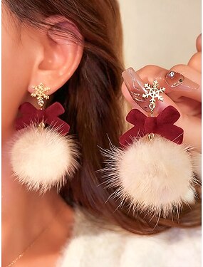 Brincos femininos de Natal com pompons em formato de floco de neve, feitos de liga metálica e pele sintética, perfeitos para festas de fim de ano e presentes.