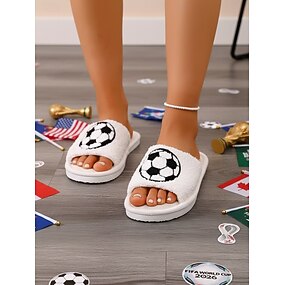 Chinelo feminino branco de pelúcia com estampa de bola de futebol – chinelo de casa macio e confortável, com biqueira aberta e palmilha de tecido macio, ideal para casa, quarto e para fãs de esportes.