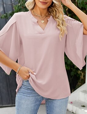 Mulheres Camisa Social Blusa Linho de algodão sintético Franzido Tecido Vintage à moda Meia Manga Decote V Tops regulares Diário Feriado Para Noite Preto Branco Rosa Verde Cinzento Verão Primavera