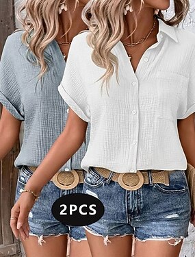 Pacotes múltiplos 2pcs Mulheres Colarinho de Camisa Manga Curta Preto / Branco Camisa Social Blusa Calção Bolsos Botões Tecido Casual Diário Algodão Verão