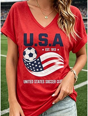 Camiseta feminina de futebol com estampa gráfica vintage, estilosa e clássica, manga curta, decote em V, ideal para uso diário e fim de semana, nas cores azul, preta, branca e vermelha, perfeita para
