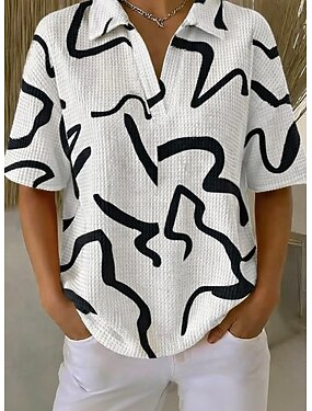 Mulheres Camiseta Waffle Tops tricotados texturizados Tops de verão Imprimir Gráfico Geométrica à moda Clássico Manga Curta Gola Redonda Decote Redondo Tops longos Casual Diário Branco e Preto Preto