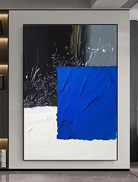 Pintura abstrata grande pintada à mão, arte de parede com textura azul, arte de parede abstrata azul, pintura abstrata grande em preto, azul e branco, decoração de parede boho para sala de estar.