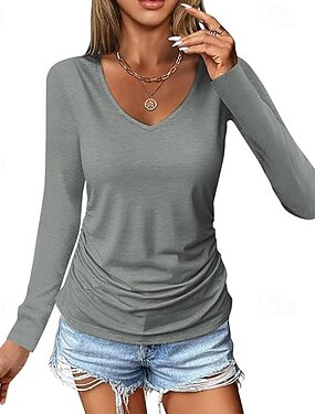 Mulheres Camiseta T-shirt Tecido Moda à moda Clássico Manga Longa Decote V Tops regulares Diário Para Noite Final de semana Preto Branco Vinho Azul Marinha Roxo Verão Primavera