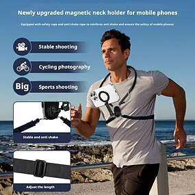Suporte magnético para celular com fixação no pescoço, perfeito para pesca esportiva e câmeras de ação, permitindo filmagens em primeira pessoa e fixação no peito com as mãos livres. Suporte magnético